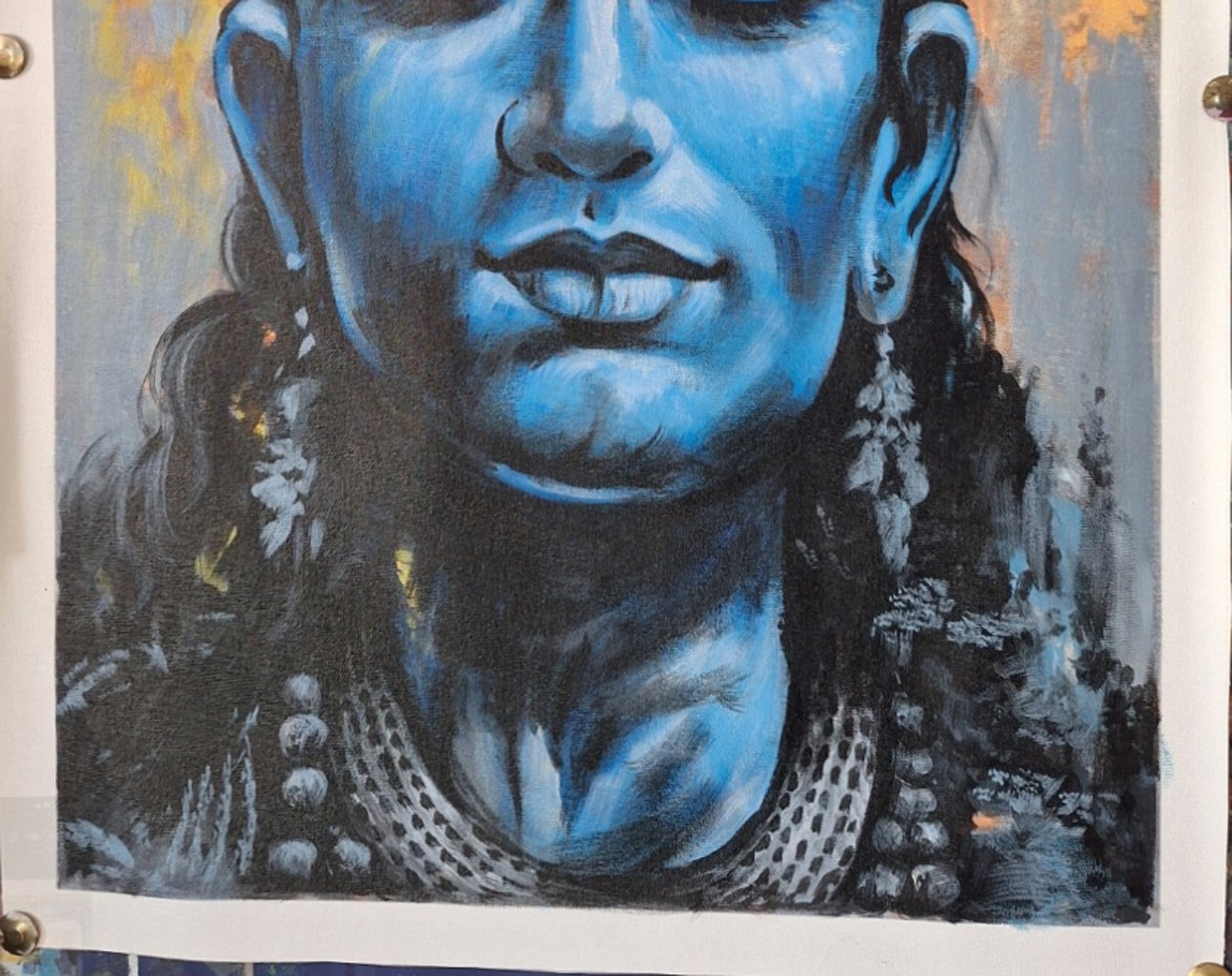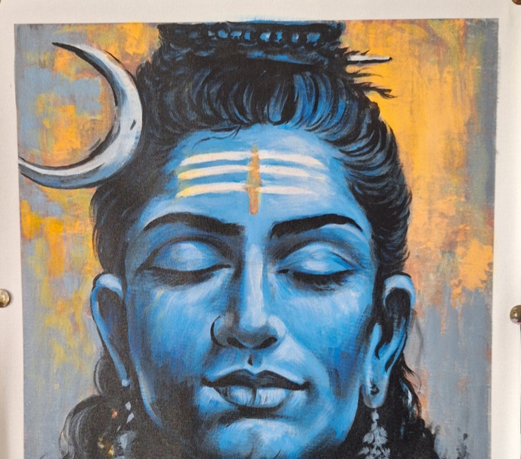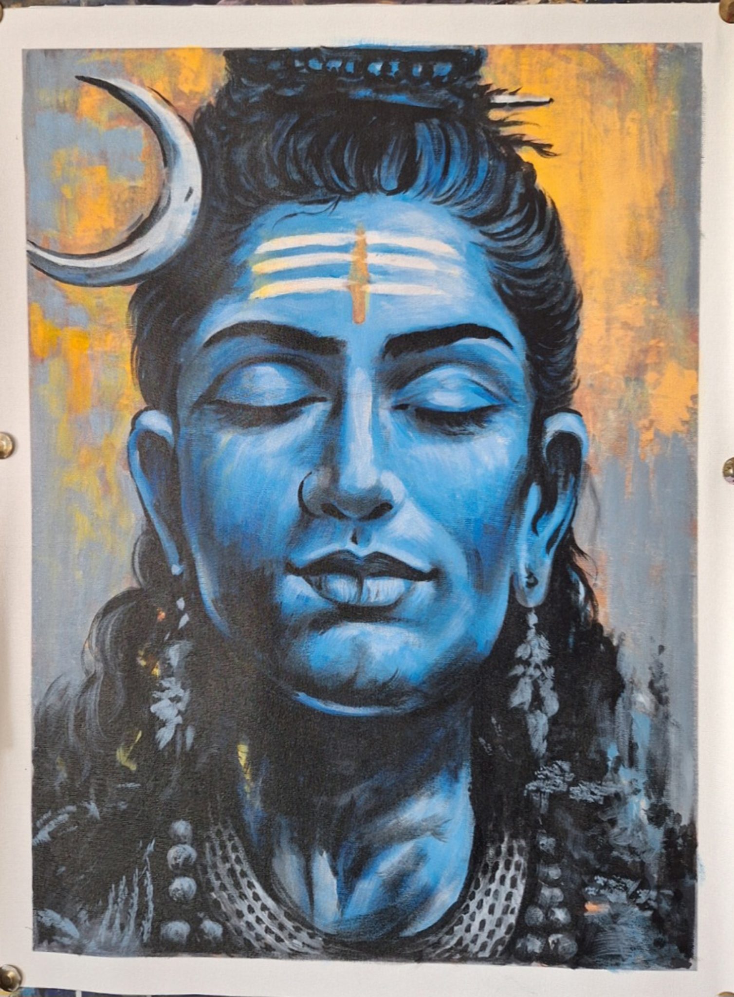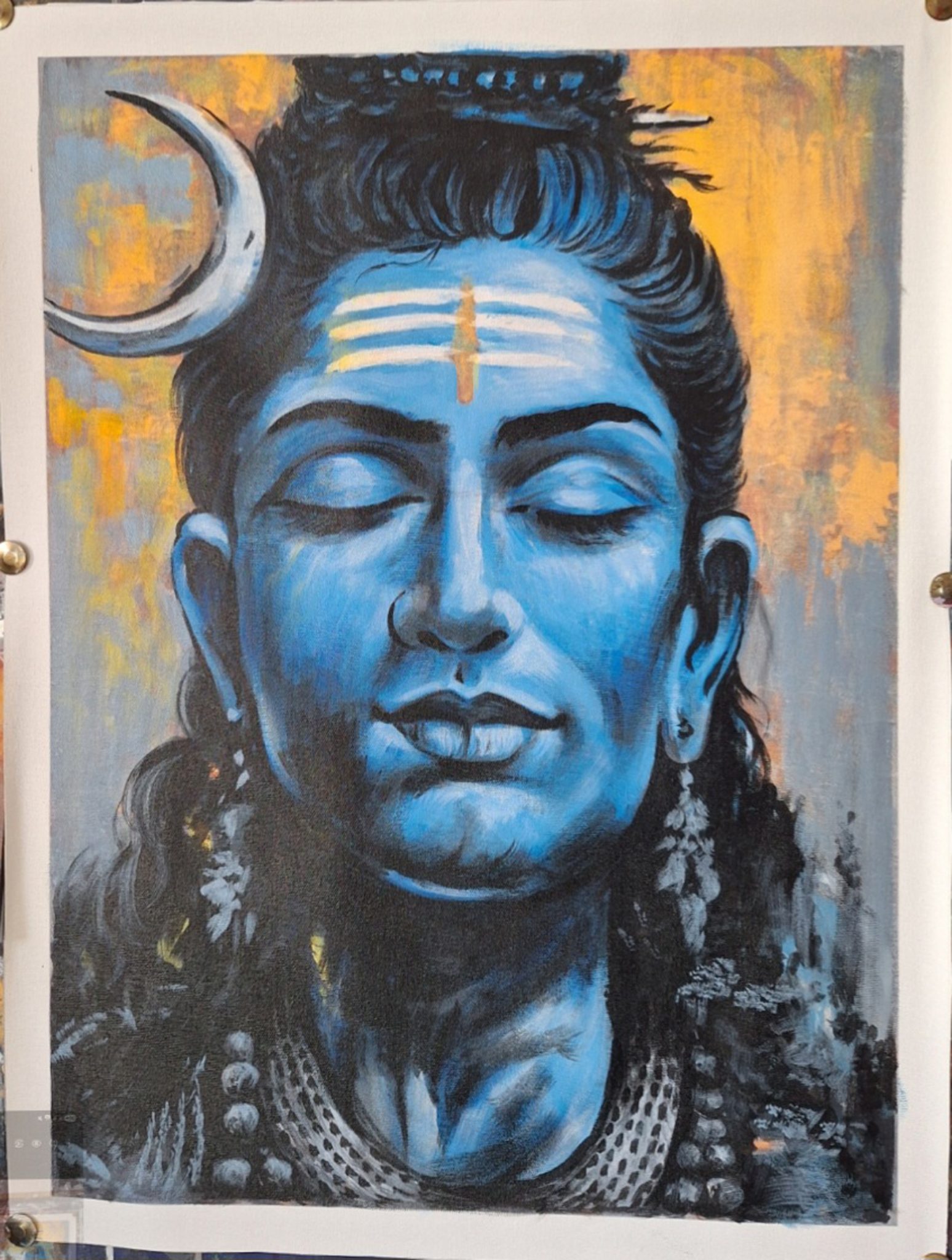 A vibrant portrayal of Hindu deities Shiva and Parvati depicted as one entity. The artwork showcases striking symmetry and rich cultural symbolism.100% Hand painted lord Shiva painting on canvas using acrylic colours. it has been crafted in a way so that it makes your place beautiful,