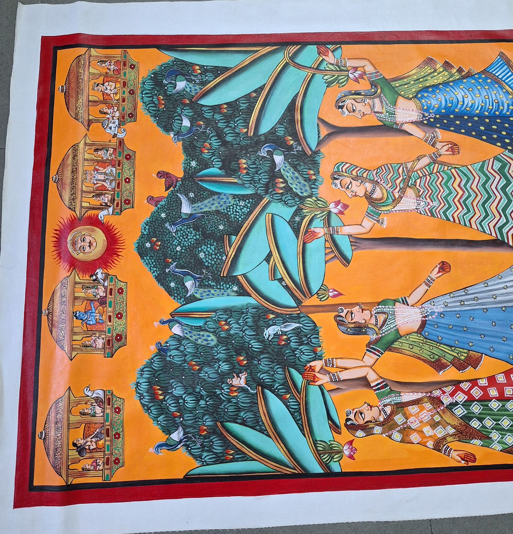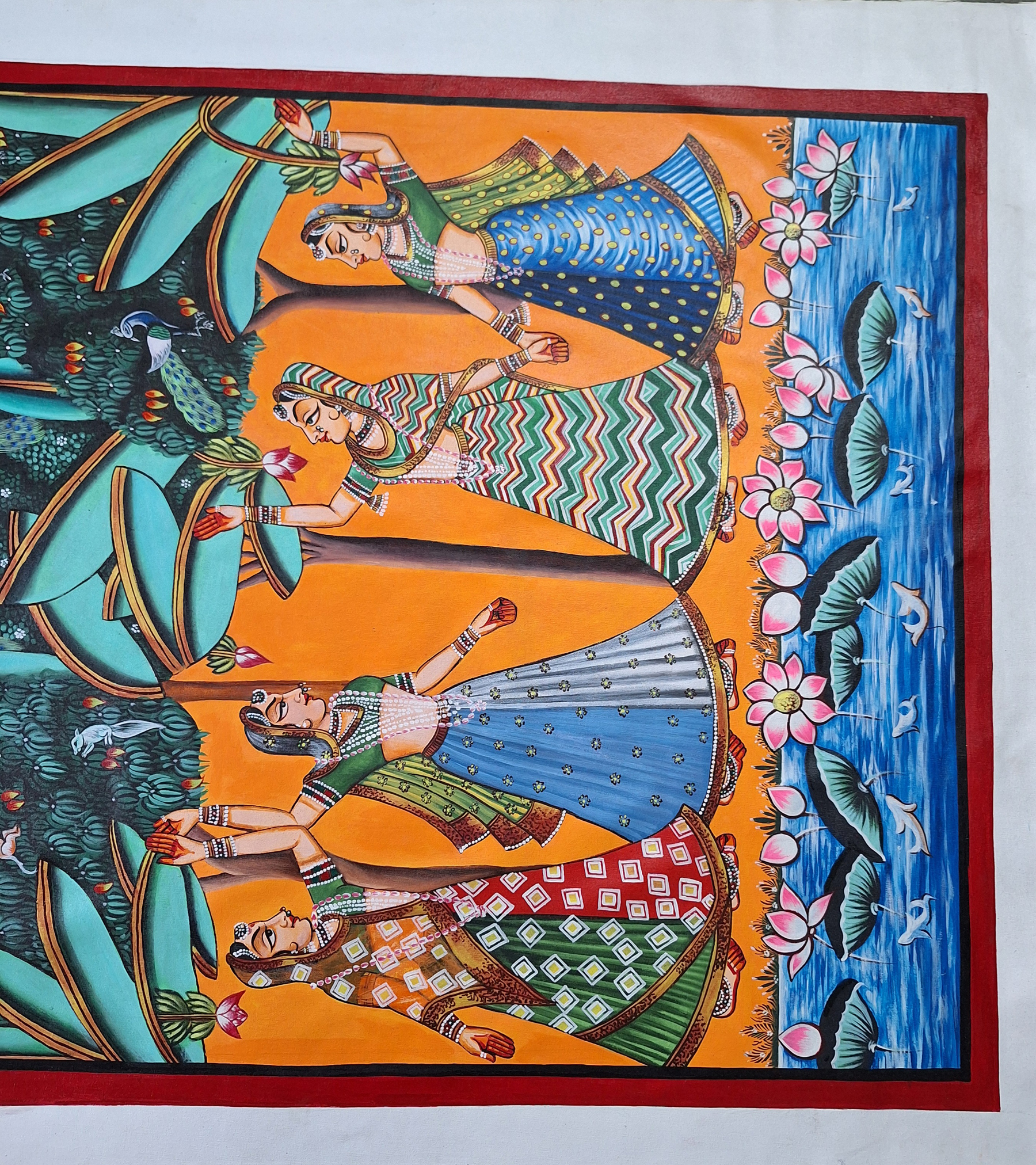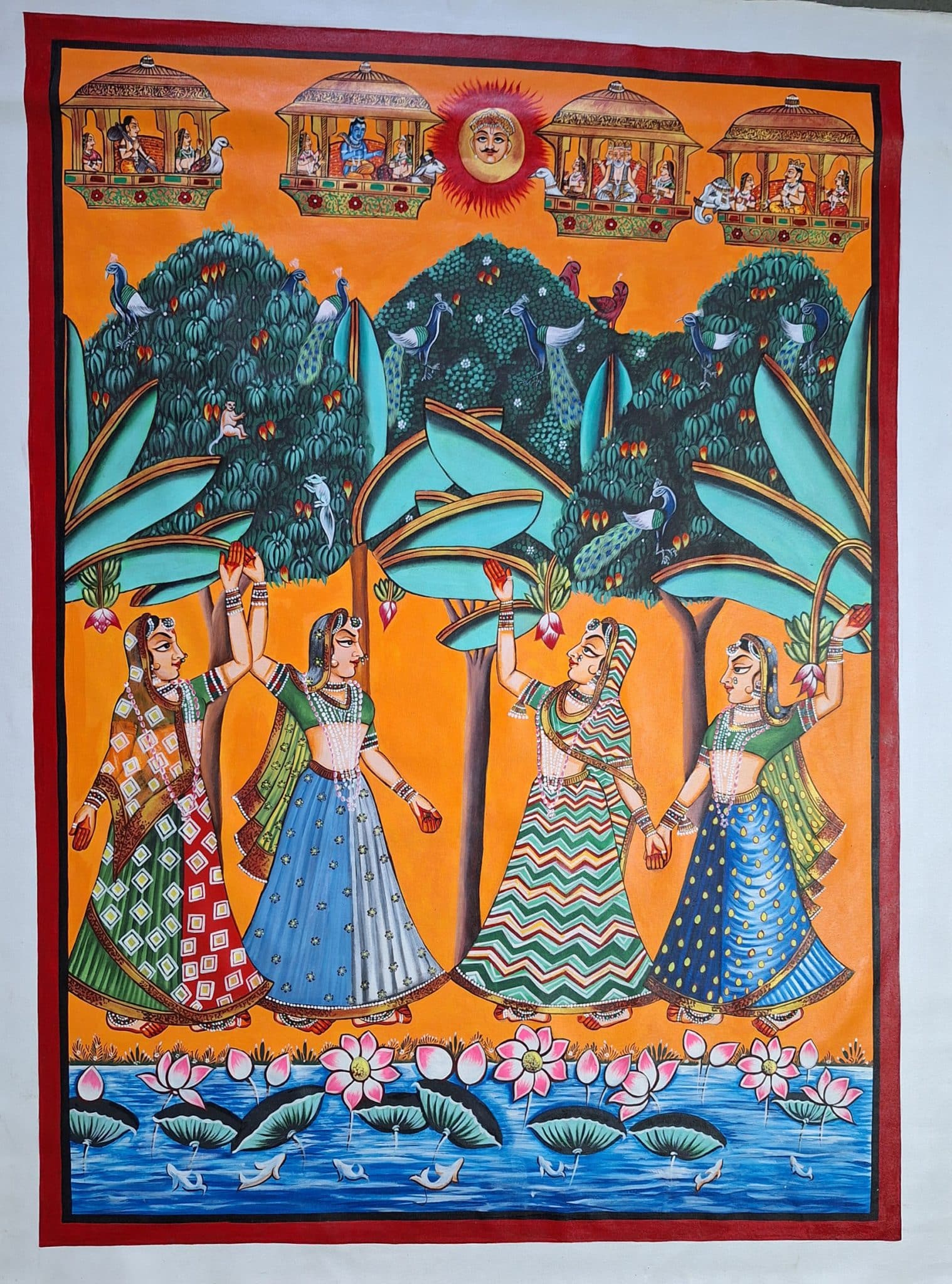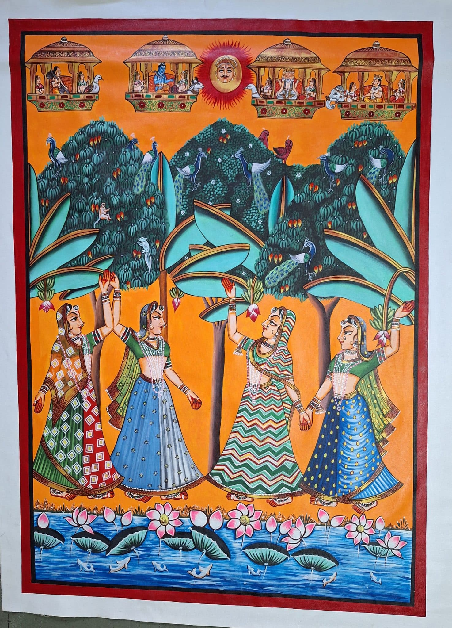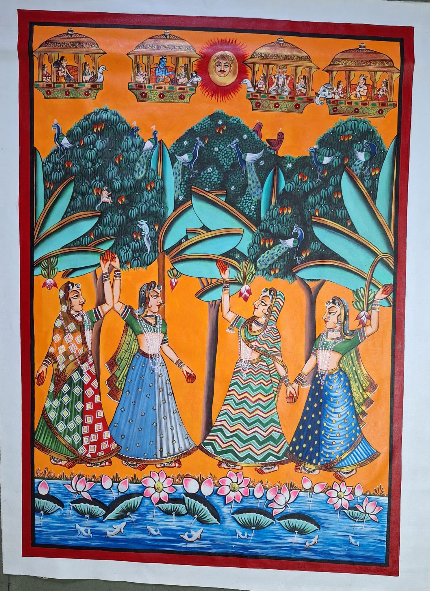 Four women in colorful attire perform a traditional dance in a vibrant garden setting. Above, celestial figures are depicted, and a body of water with lotus flowers lies below.The pichwais are painted using acrylic colors and gold leaf and are also made with hand embroidery. They can be made of brocade and thick silk, stitched, painted, and dyed, tinsel printed, block printed, or even constructed of machine-made lace. Though pichwais were mostly created in Gujarat and Rajasthan, there are a few specimens from the Deccan as well as machine-made lace or roller-printed pichwais from Europe. Creating a Pichwai is an elaborate and time-consuming process, amazing details are achieved by expert artists using natural colors and brushes. The Pichwais are changed at the temple daily, according to the seasons, and for various rites and celebrations. Pichwais depict celebrations and festivals such as Sharad Purnima, Raas Leela, Annakoot or Govardhan Puja, Janmashtami, Gopashtami, Nand Mahotsav, Diwali